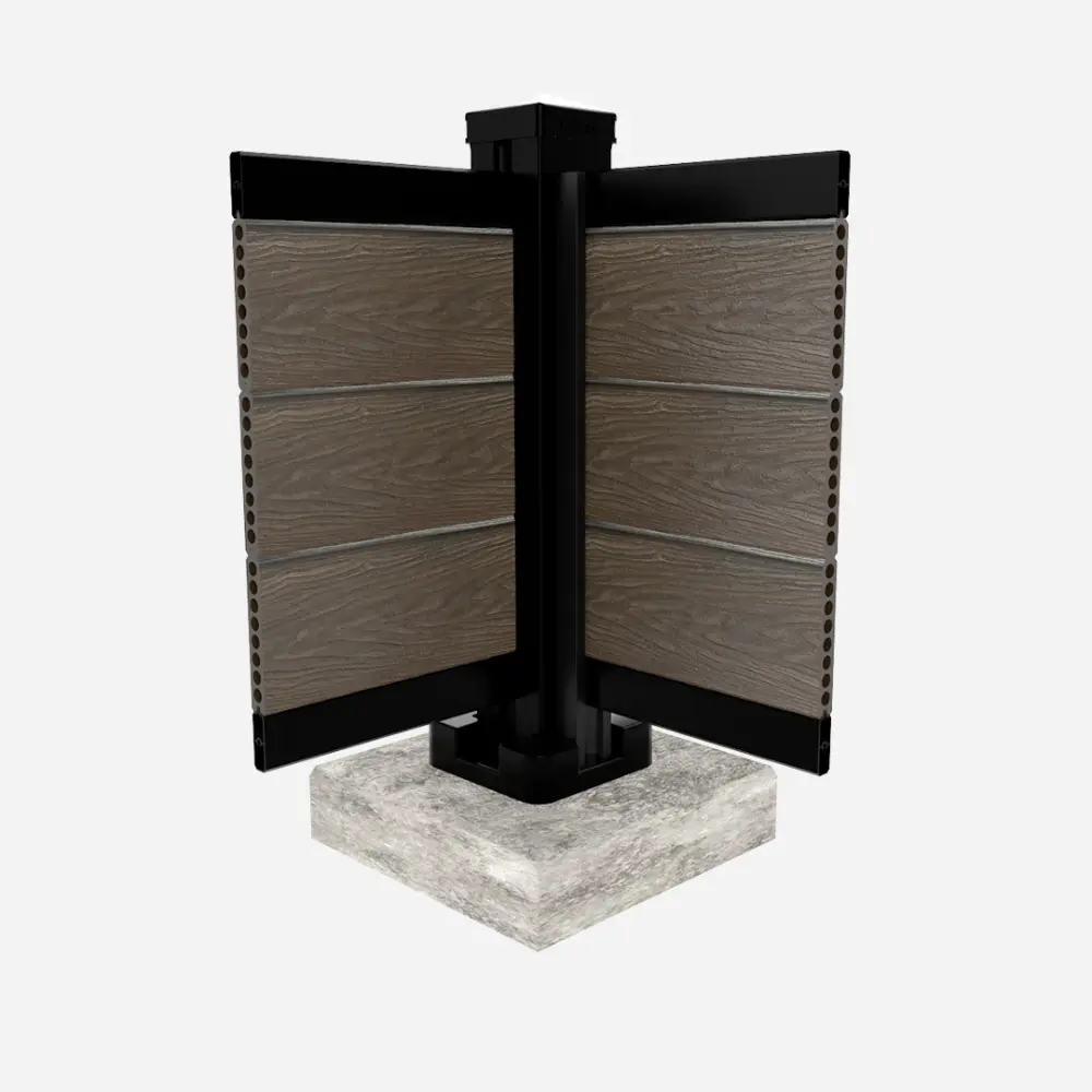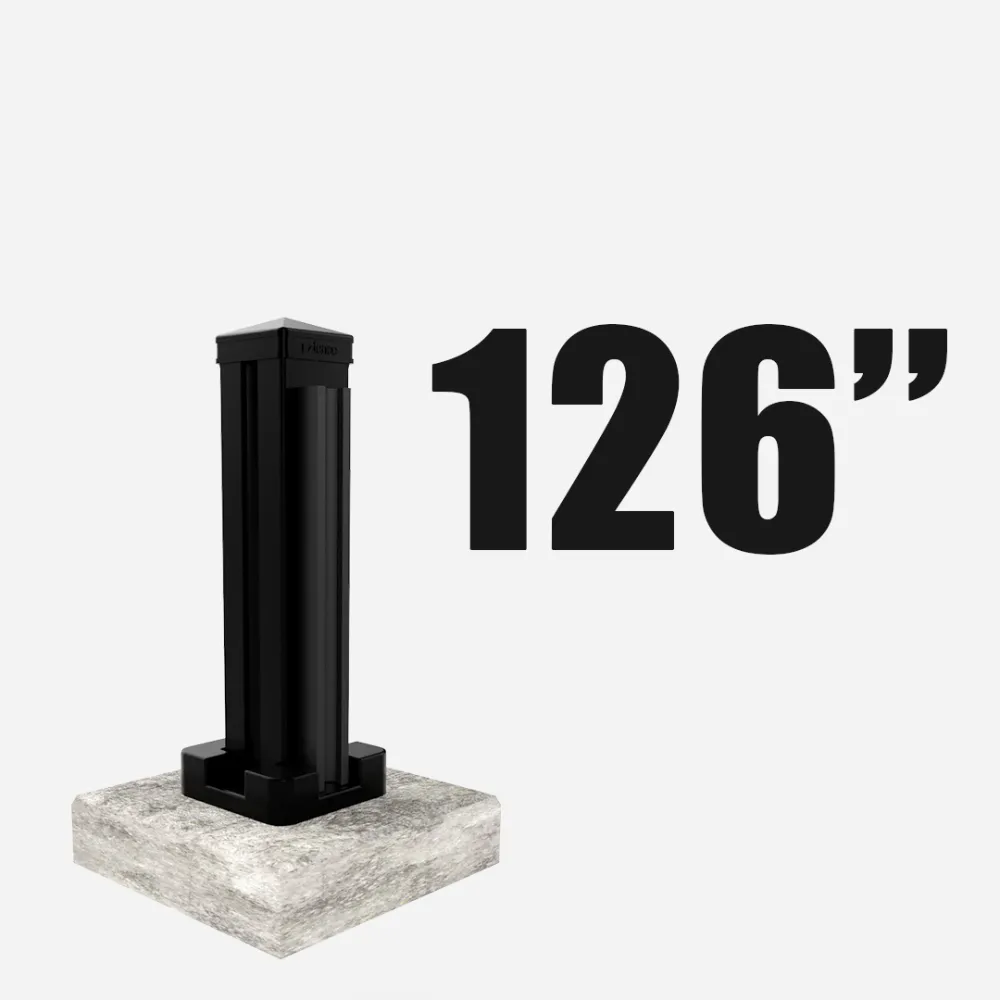 Corner posts securely mounted on a post base, available in 96”, 126”, 150”, and 192” heights, and is designed for installation on a flat, solid concrete surface.