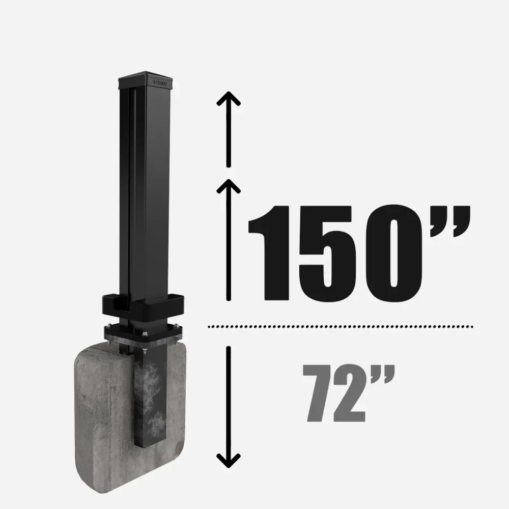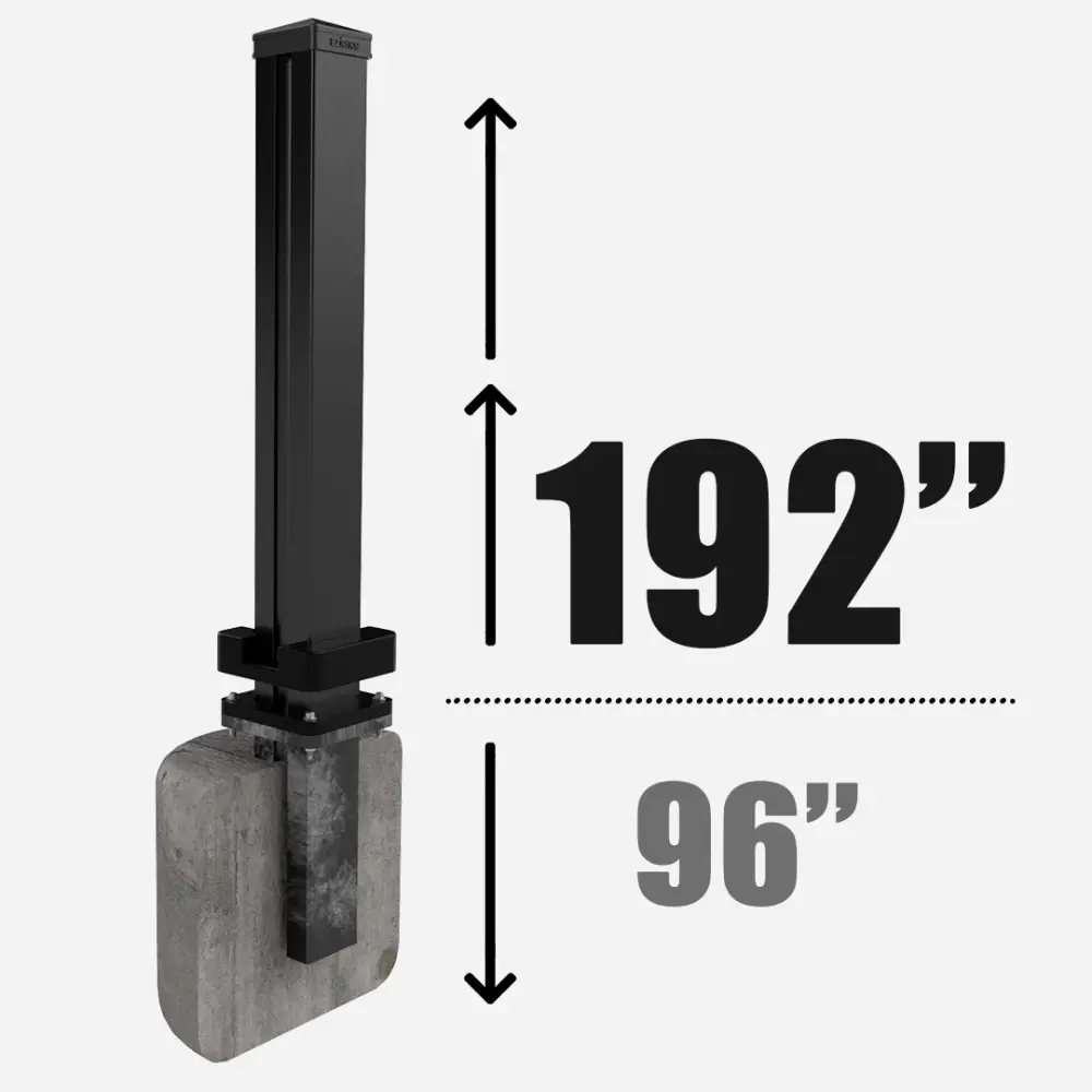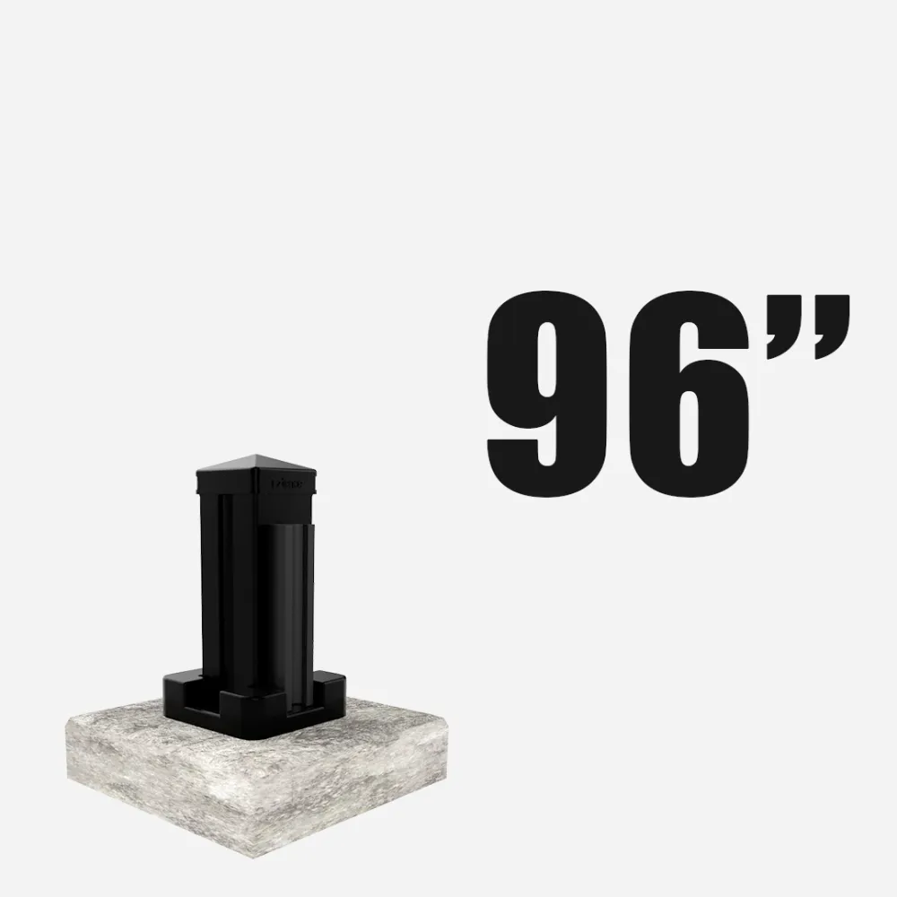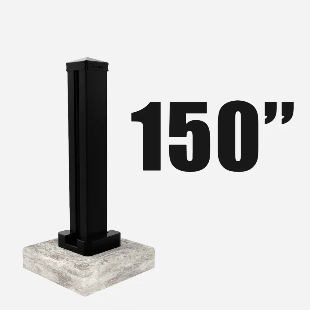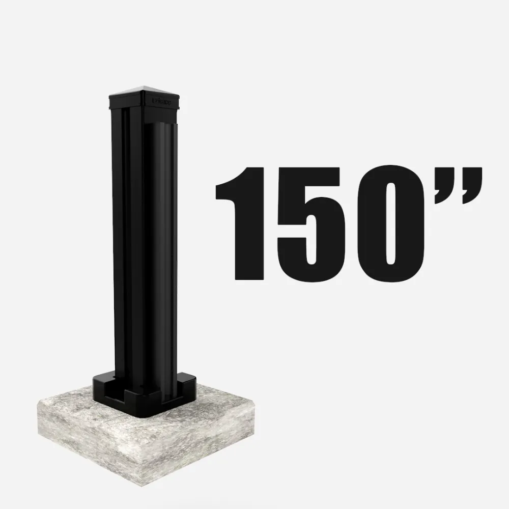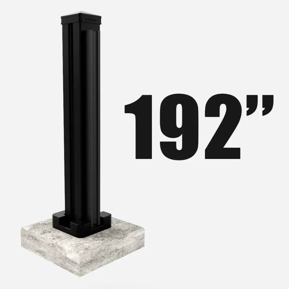 Line post securely mounted on a post base, available in 96”, 126”, 150”, and 192” heights, and is designed for installation on a flat, solid concrete surface.