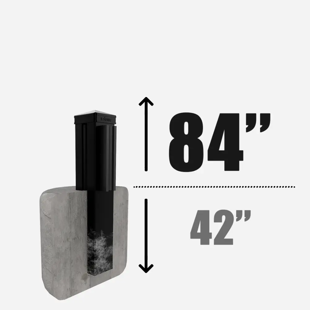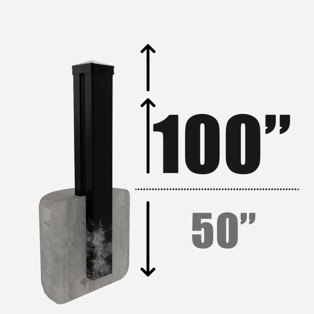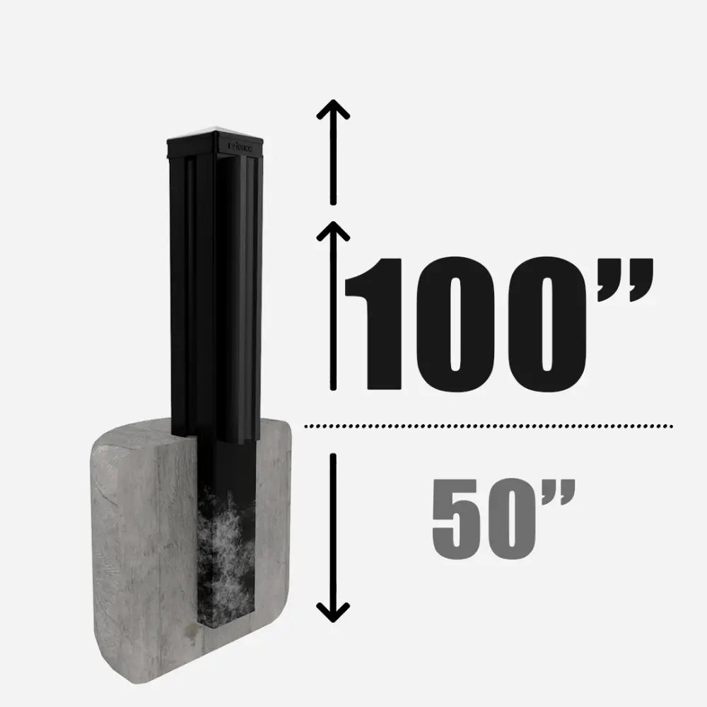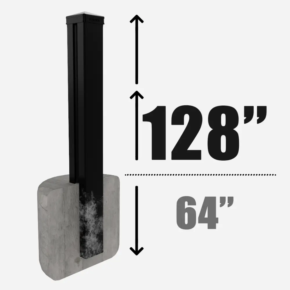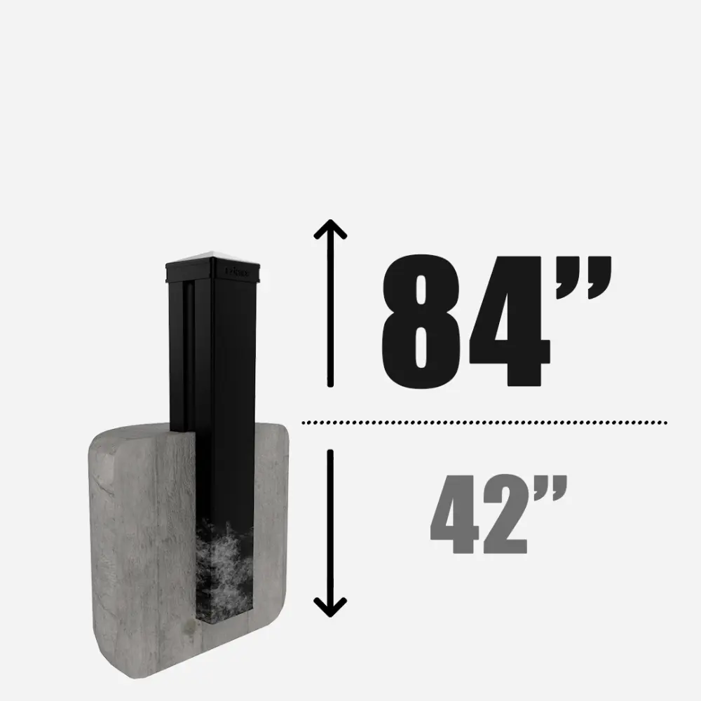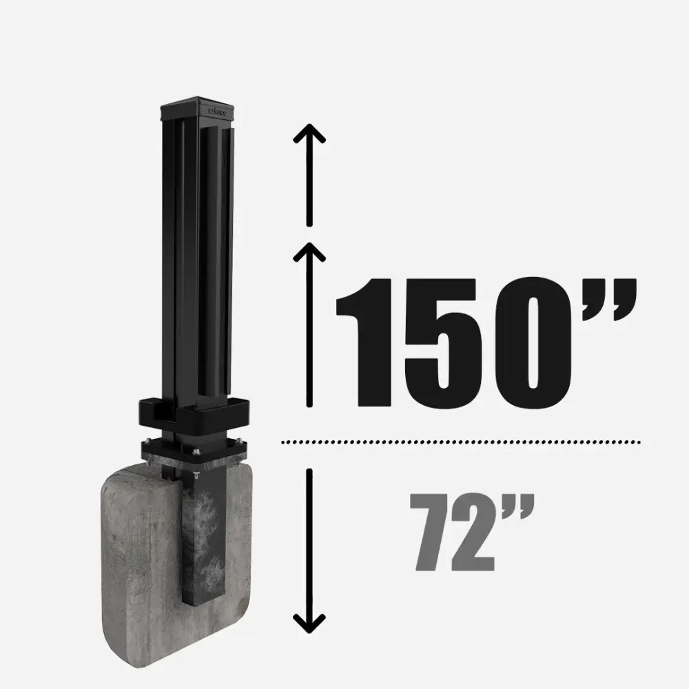Line post securely mounted on a post base, available in 96”, 126”, 150”, and 192” heights, and is designed for installation on a flat, solid concrete surface.