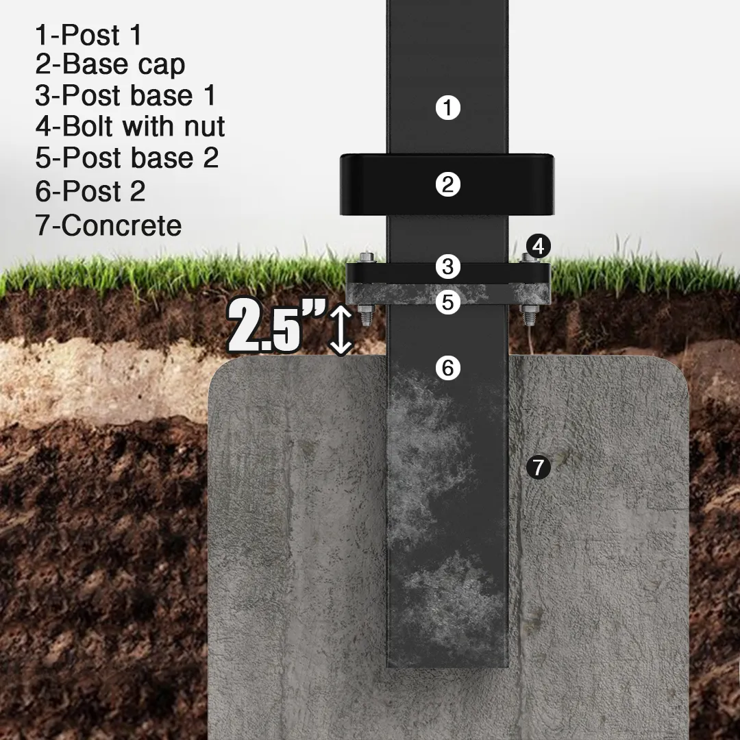 The vertical part of the pile is embedded into the ground, while the base plate remains above the concrete level with just 2.5 inches. - Pouring Concrete: Concrete is poured into the hole and solidifies, creating a strong, immovable foundation for the pile.