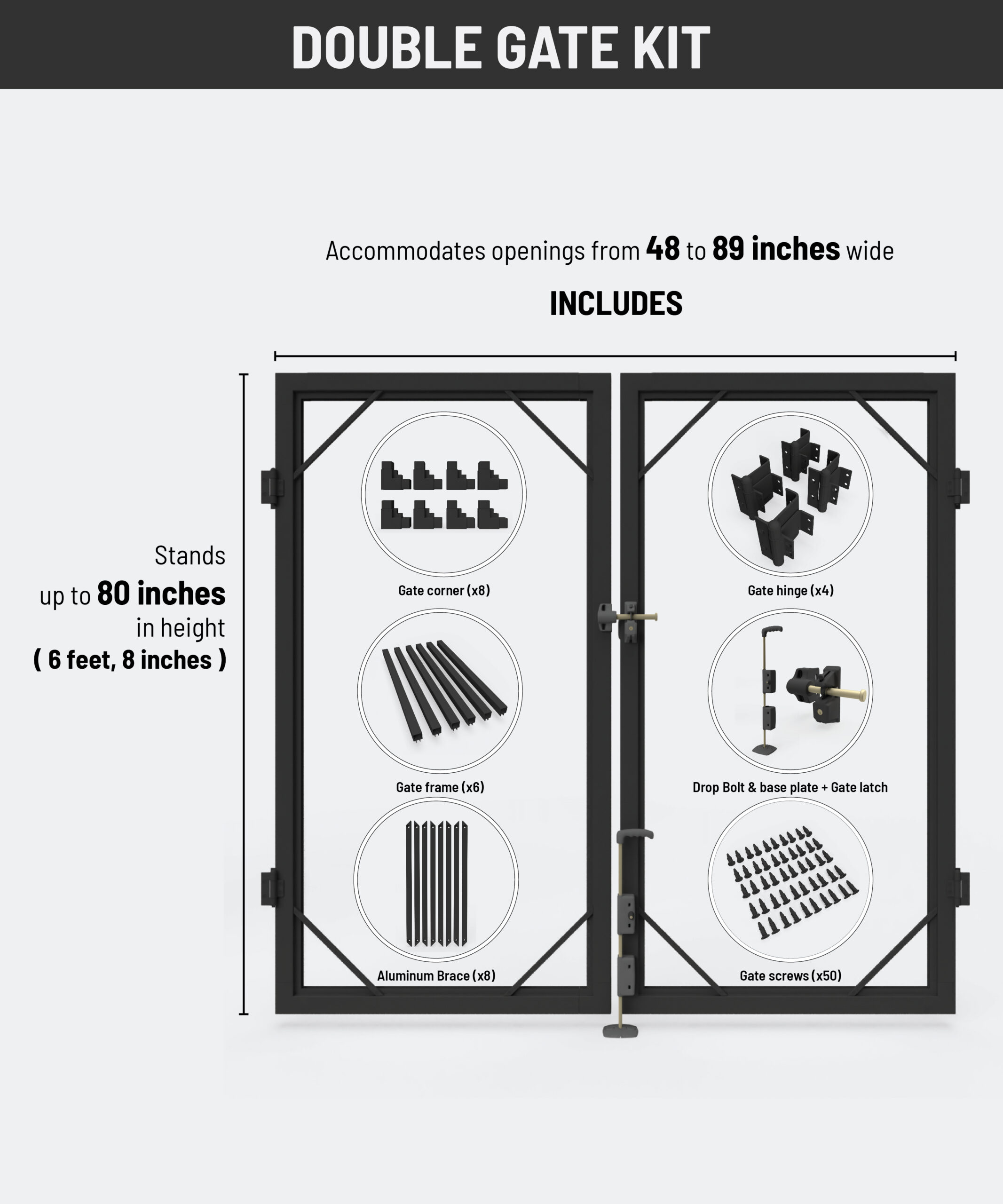 This adjustable double gate frame kit allows you to create a stunning double wood gate with an opening of 48″ to 89″ wide and up to 6ft tall, for a timeless look, the composite fence gate boards are sold separately to perfectly complement your existing fence. This versatile kit caters specifically to the needs of Canadian homeowners, ensuring a seamless installation process.